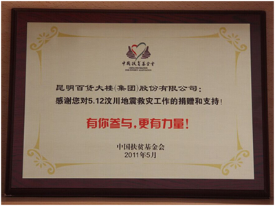 2011年5月中國扶貧基金會感謝昆百大集團(tuán)5.12汶川地震救災(zāi)工作的捐贈和支持!有你參與,更有力量!
