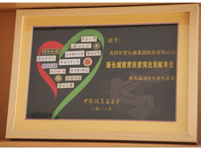 2012年中國扶貧基金會授予昆百大集團(tuán)新長城教育扶貧突出貢獻(xiàn)單位獎(jiǎng)項(xiàng)