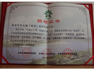 2012年“云南紅土情 光彩進(jìn)萬家——民營企業(yè)感恩行動”活動捐款25萬元的捐贈證書