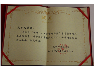2009年昆明市慈善總會頒發(fā)“迎六一關(guān)愛貧困兒童”捐款貳萬元證書